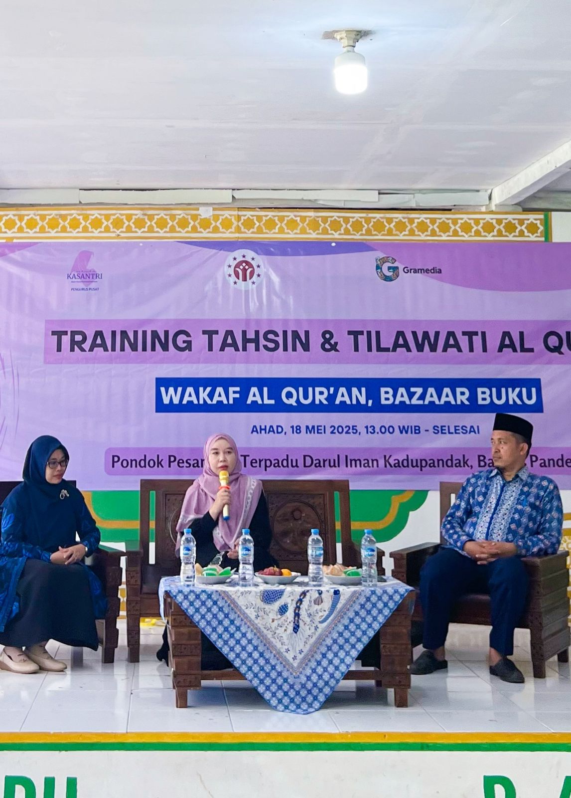 Jawapostnews.co.id, Pandeglang — Dalam semangat mendukung program Tuntas Baca Al Qur’an (TBQ) dari Kementerian Agama RI, organisasi nasional Kasantri Indonesia menggelar Training Tahsin dan Tilawah Al Qur’an di Pondok Pesantren Terpadu Darul Iman, Pandeglang, Banten. Acara ini bukan hanya menjadi ajang pelatihan peningkatan kualitas bacaan Al Qur’an, tetapi juga momentum berbagi, karena Kasantri Indonesia bersama Gramedia Pustaka Utama menyerahkan wakaf Al Qur’an untuk perpustakaan pondok pesantren.
