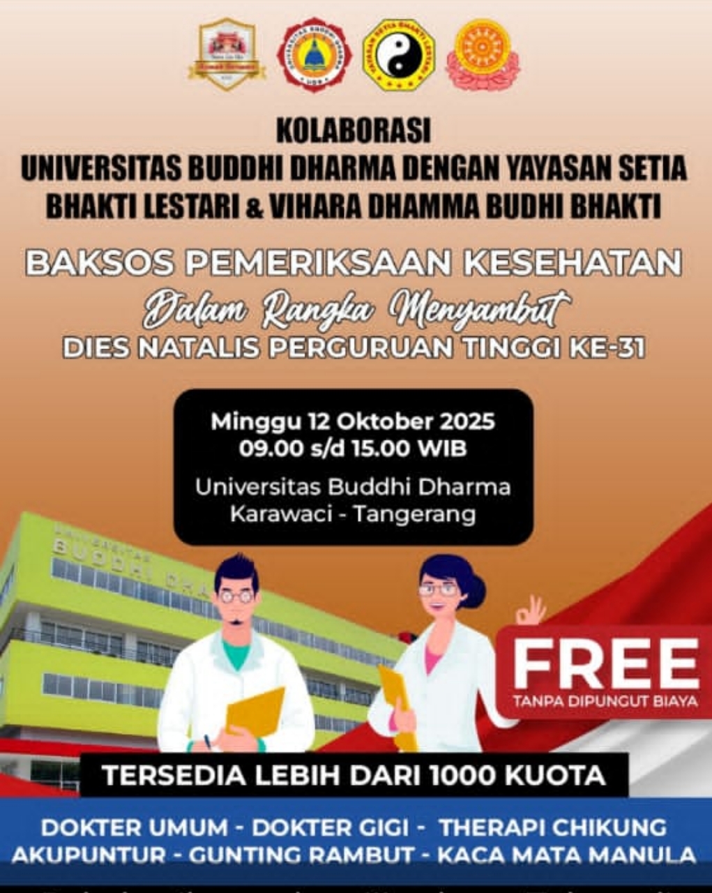 Tangerang, Jawapostnews.co.id — Dalam rangka menyambut Dies Natalis ke-31, Universitas Buddhi Dharma menggelar kegiatan Bakti Sosial Pemeriksaan Kesehatan Gratis yang berlangsung di kampus utama Universitas Buddhi Dharma, Karawaci, Kota Tangerang. Kegiatan ini merupakan hasil kolaborasi antara Universitas Buddhi Dharma, Yayasan Setia Bhakti Lestari, dan Vihara Dhamma Budhi Bhakti.