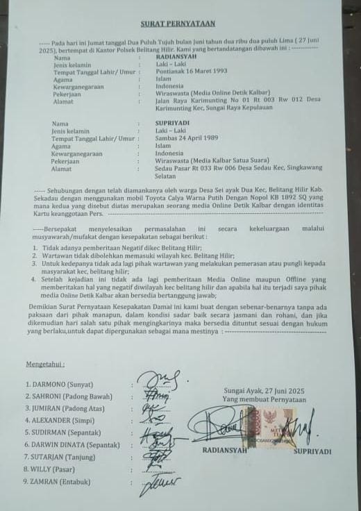 Belitang Hilir, Jawapostnews.co.id — Dunia jurnalistik kembali dikejutkan dengan beredarnya sebuah Surat Pernyataan yang ditandatangani dua wartawan media online, Radiasnyah (Detik Kalbar) dan Supriyadi (Kalbar Satu Suara), pada Jumat, 27 Juni 2025, di Kantor Polsek Belitang Hilir. Dalam surat tersebut, keduanya menyatakan kesediaan menyelesaikan permasalahan secara kekeluargaan dan menyebut tidak akan lagi melakukan peliputan di wilayah tersebut, serta tidak akan menerbitkan berita terkait aktivitas pertambangan emas ilegal di Belitang Hilir.